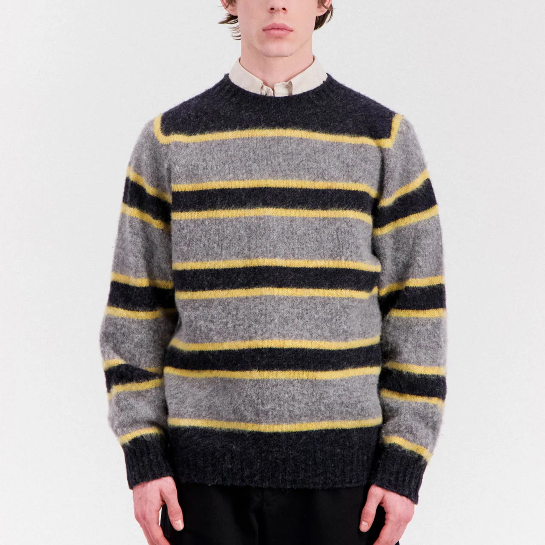 Crafted from a 100% high-quality natural wool sourced from Shetland sheep. Brushed finish, achieved by artisanal technique with natural teasels. Fine rib cuffs and hem. Hand finished.
