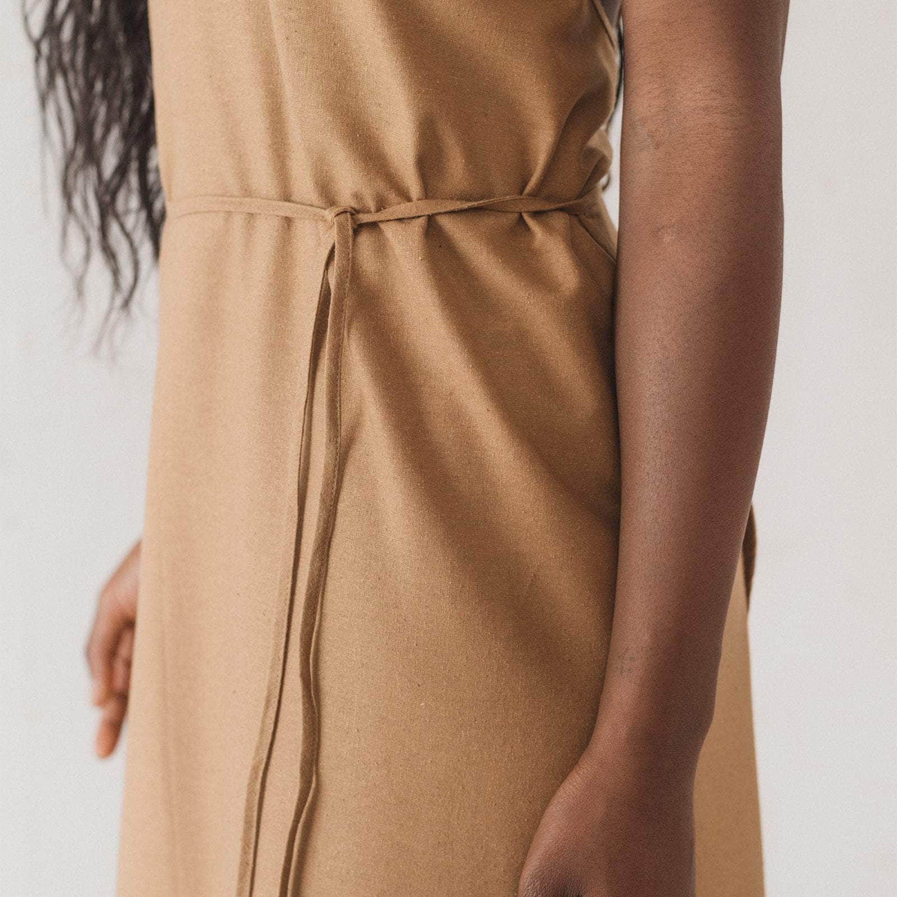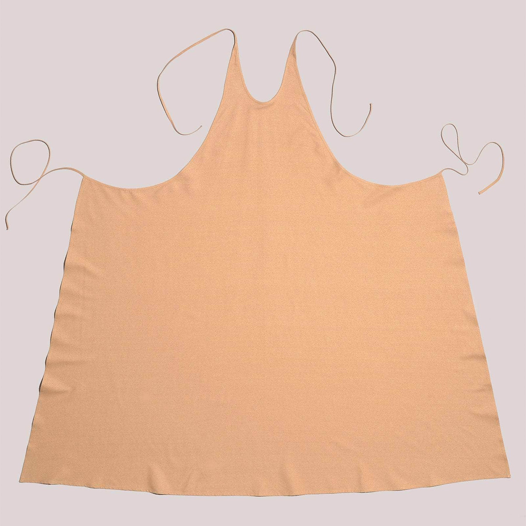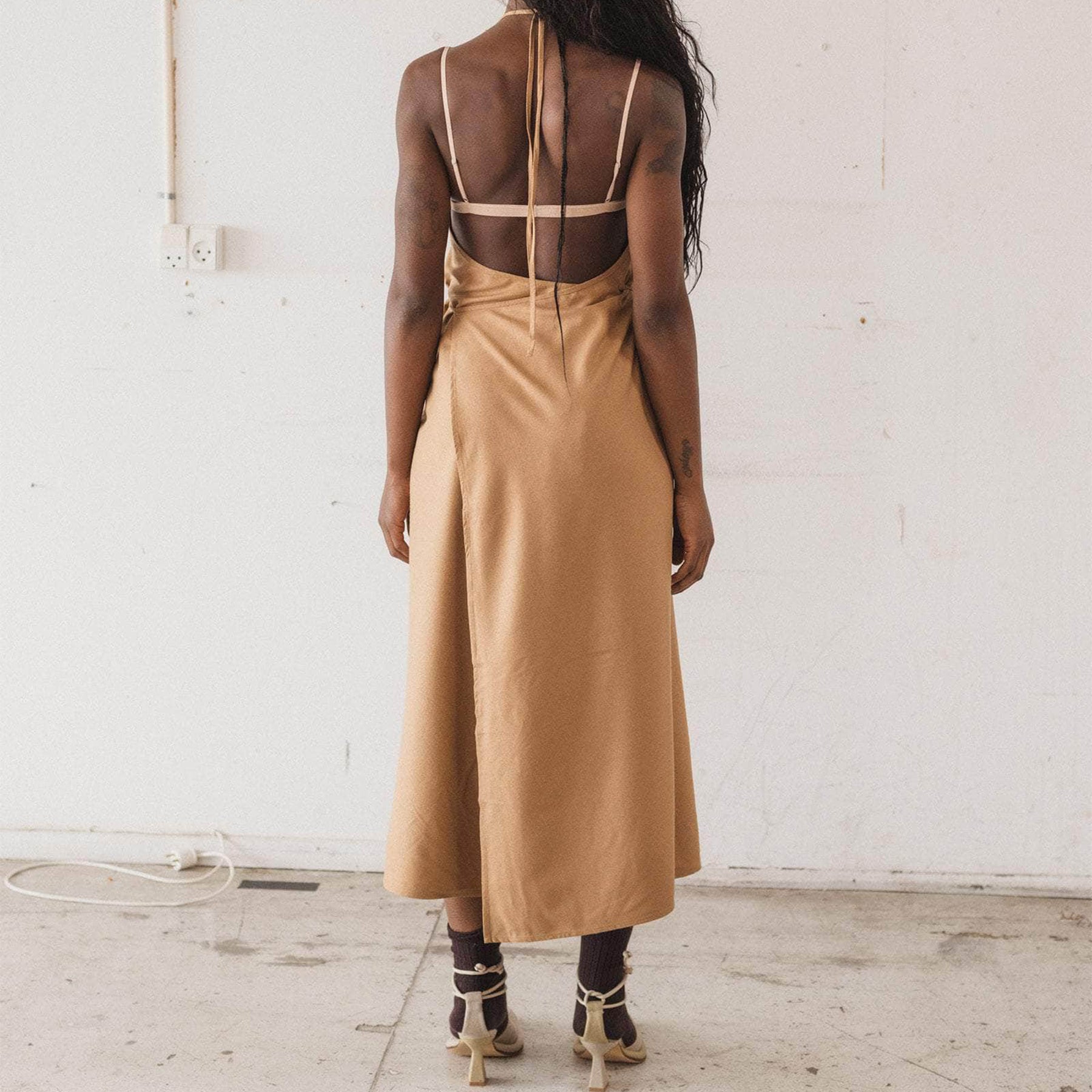 Halter neck apron wrap dress in of white wild silk. Featuring open back and ties at neck and waist.