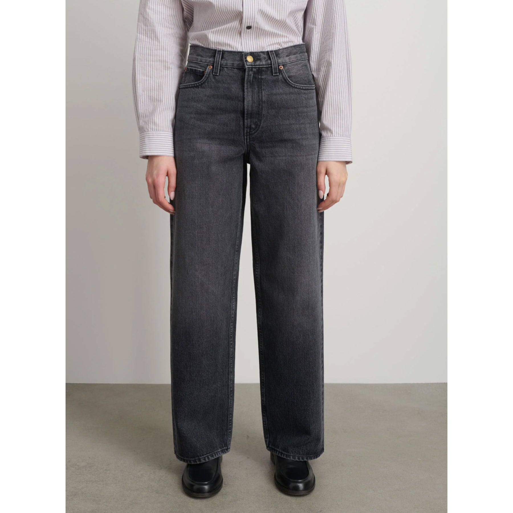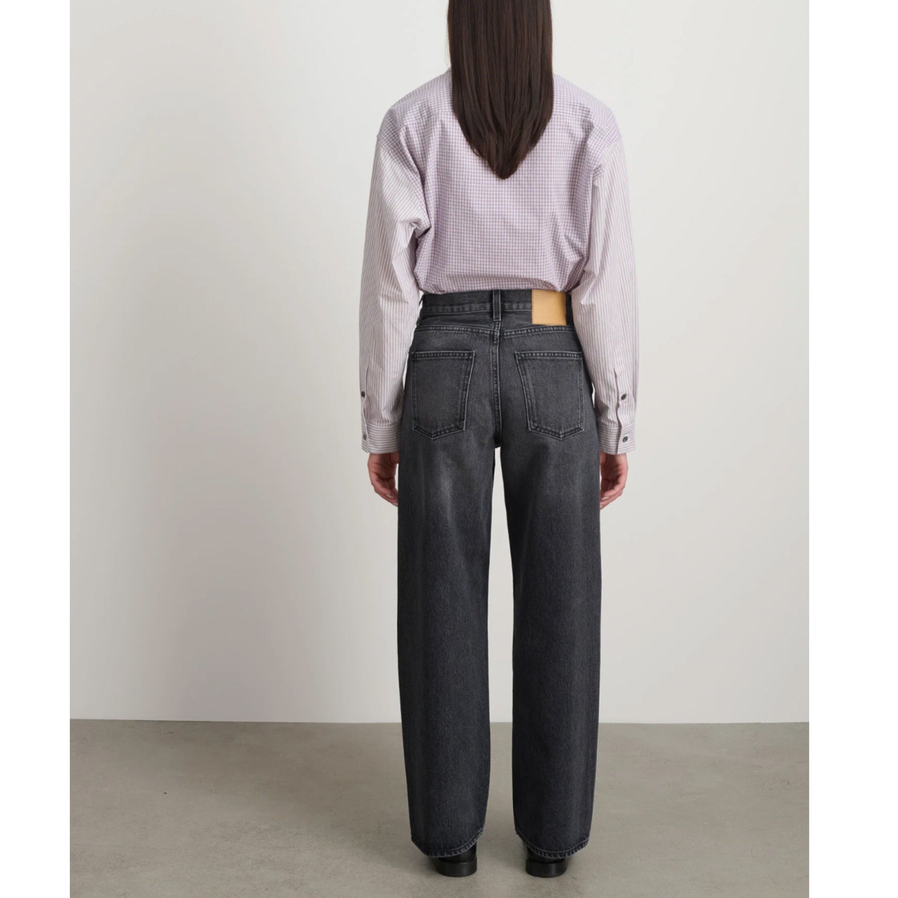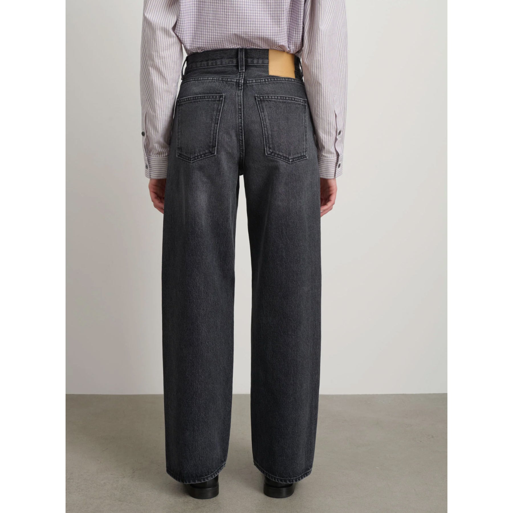 Timeless downtown ease. Cut from cotton rich black/black yarn dyed denim, that is stone washed for a tailored broken-in look. Designed to sit high on the waist, close to the hip and fall into a relaxed wide-leg silhouette. Inseam measures 30".