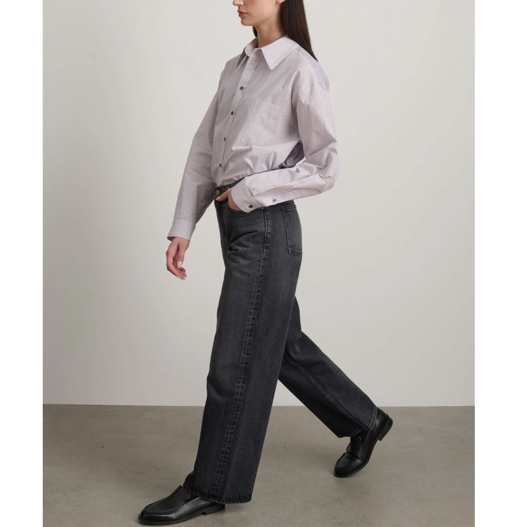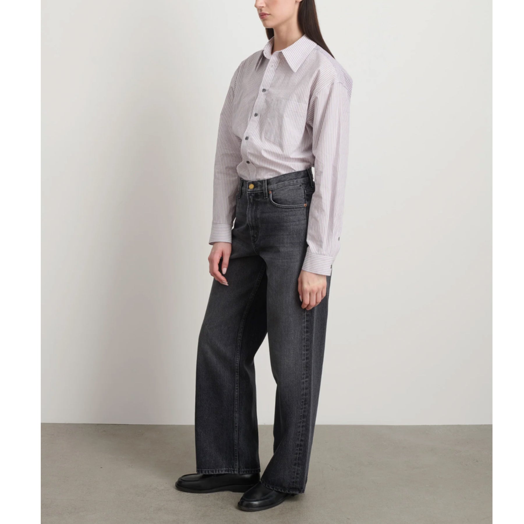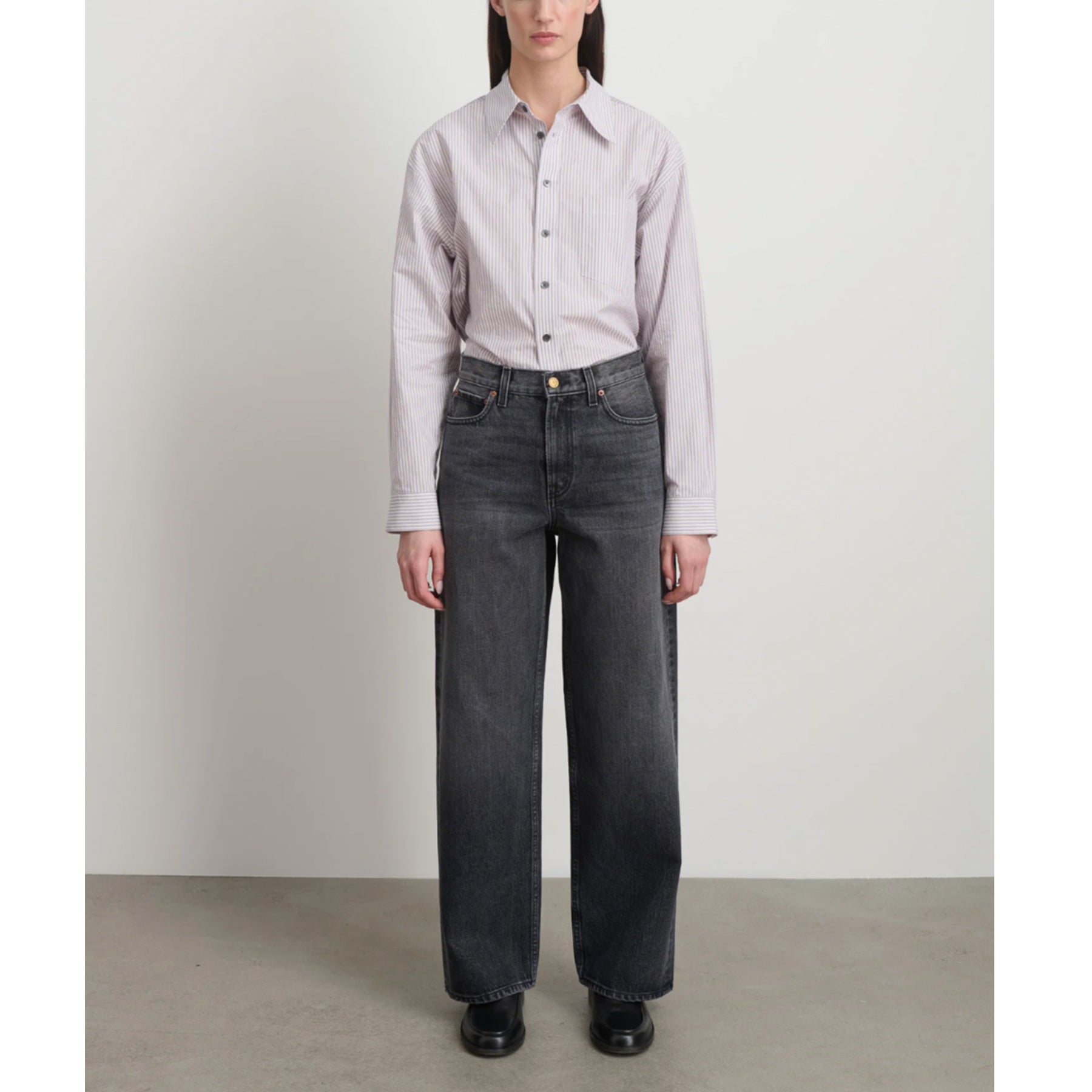 Timeless downtown ease. Cut from cotton rich black/black yarn dyed denim, that is stone washed for a tailored broken-in look. Designed to sit high on the waist, close to the hip and fall into a relaxed wide-leg silhouette. Inseam measures 30".