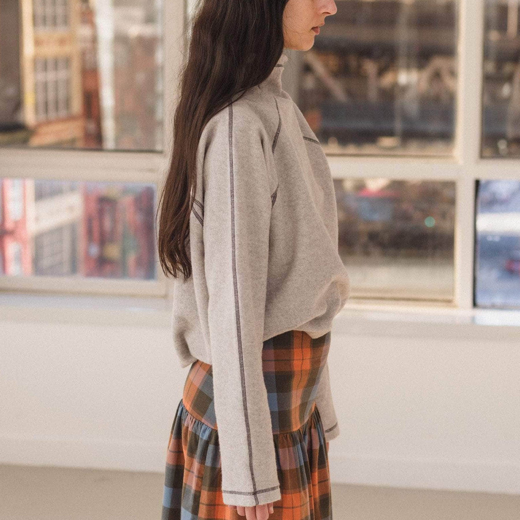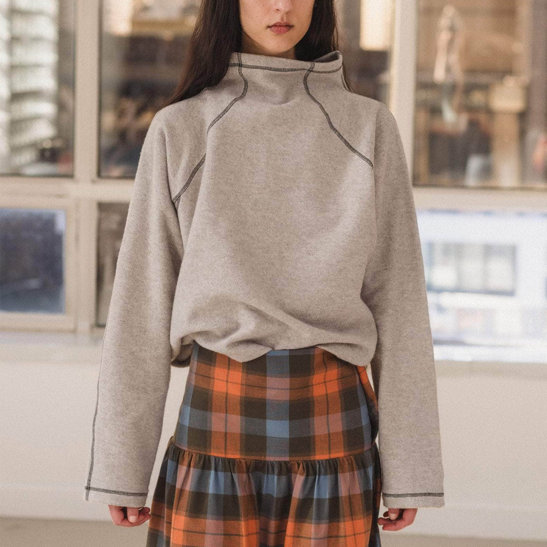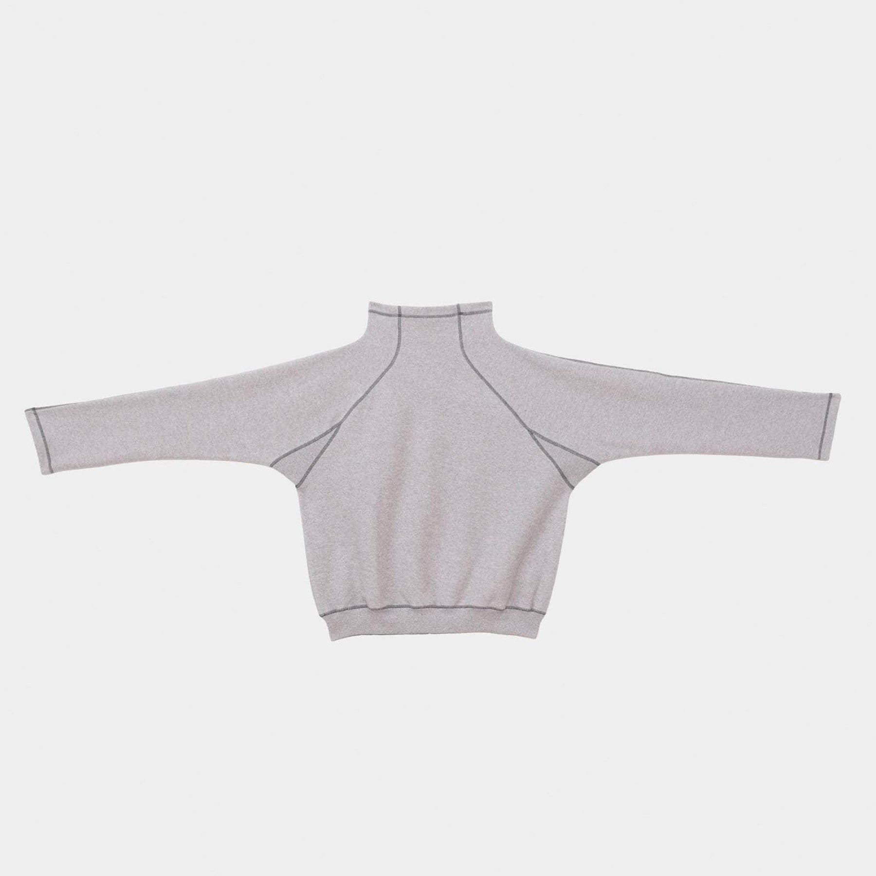 Recycled cotton fleece turtleneck featuring ribbed underarm gusset and hem. Exposed contrast seams.