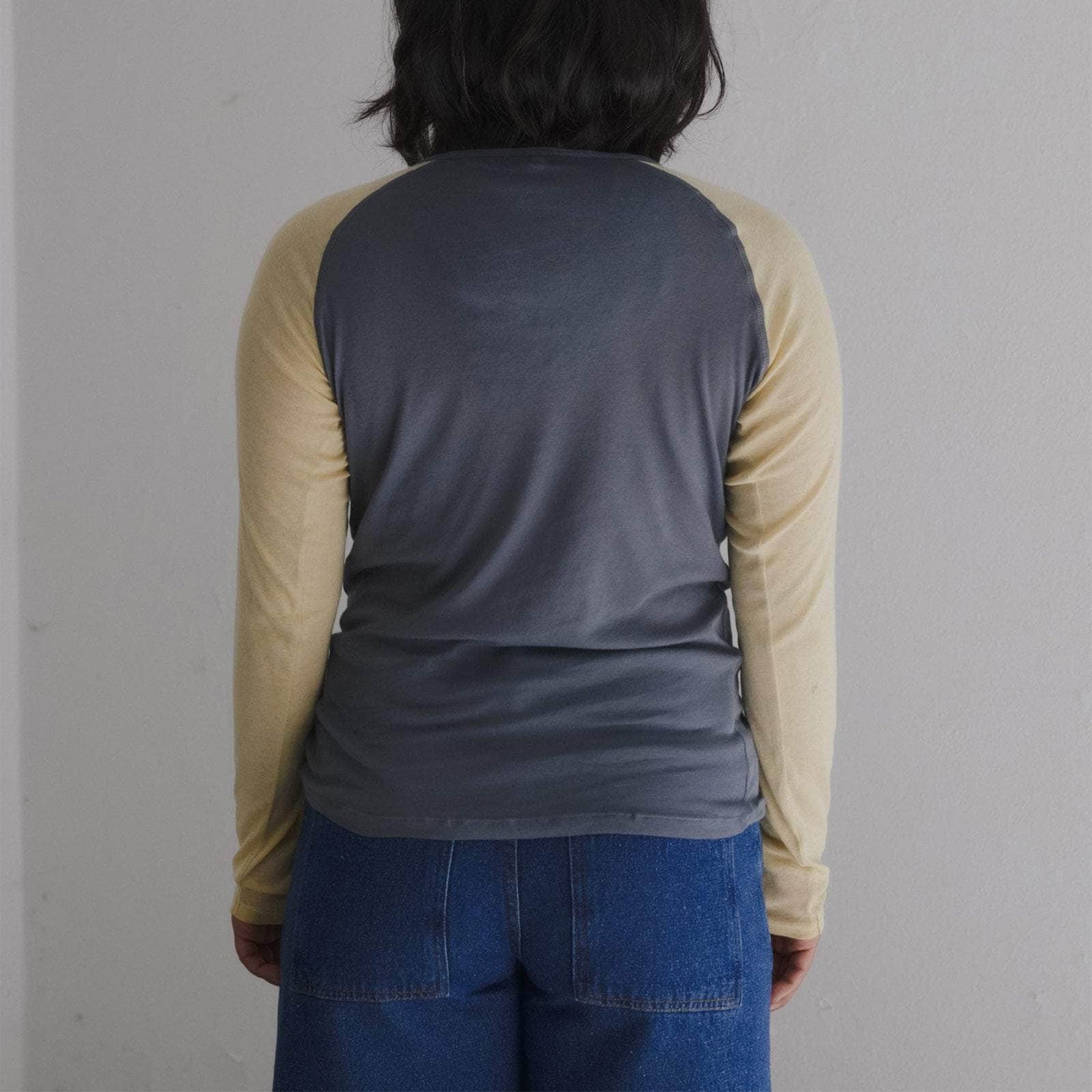 Fine oganic cotton rib tee featuring contrast raglan sleeves. Crew neckline.