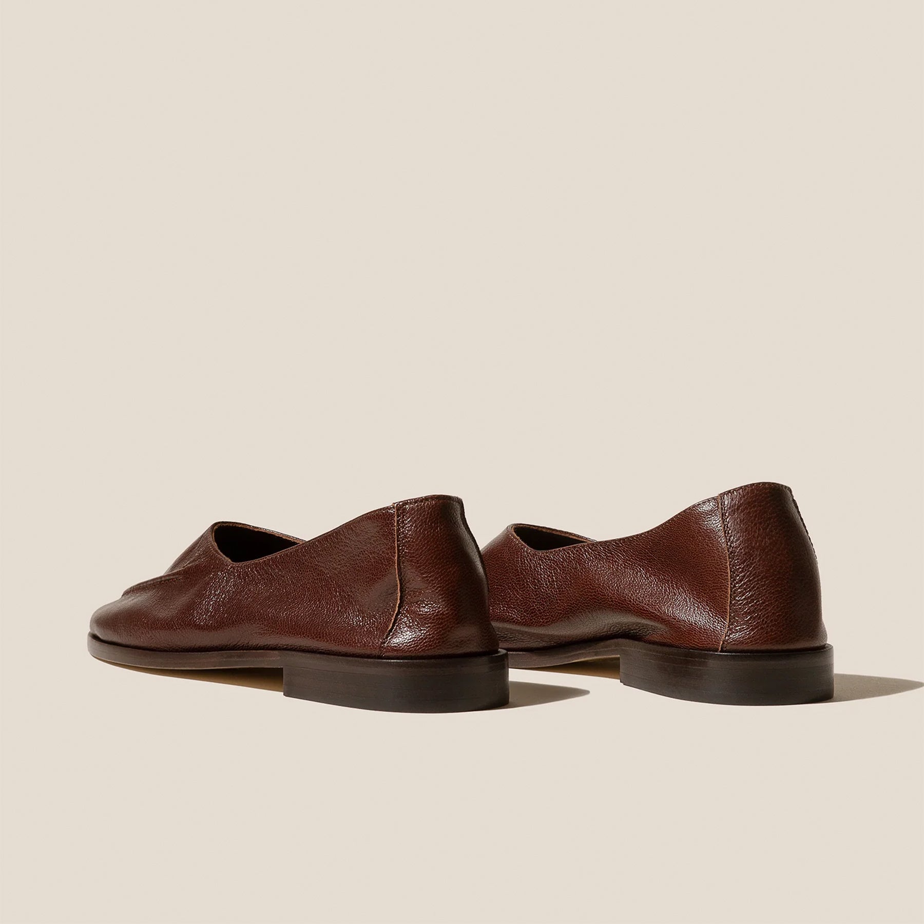 High cut deconstructed loafer crafted in supple shiny lambskin. Flexible leather outsole with 2cm stacked leather heel.