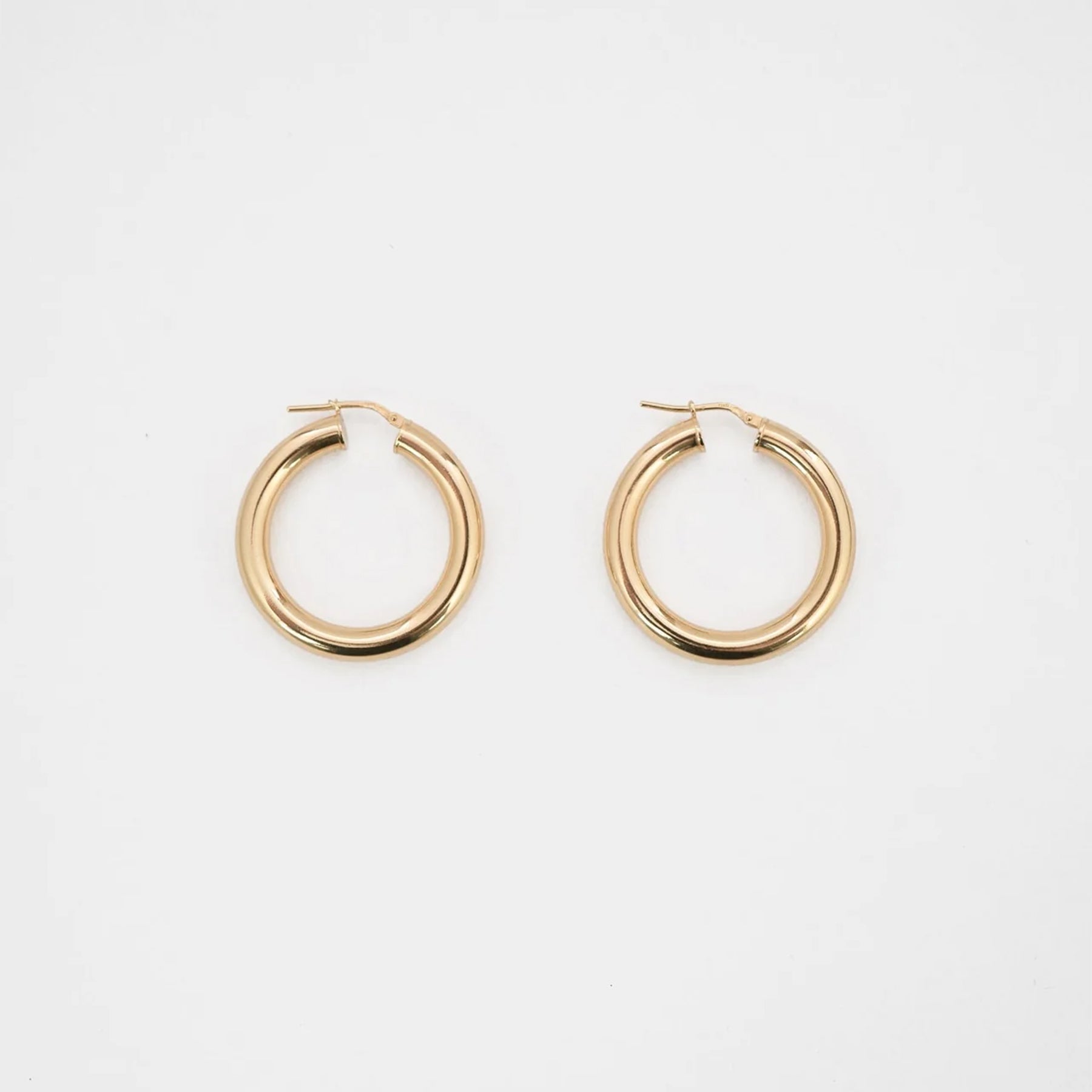 Hoop earrings made from gold vermeil in a hollow tube silhouette that’s light enough for daily wear. Diameter measures 33mm and 5mm thick. Sterling Silver base with 2.5 microns of premium 14kt gold coating. Sold as a pair.