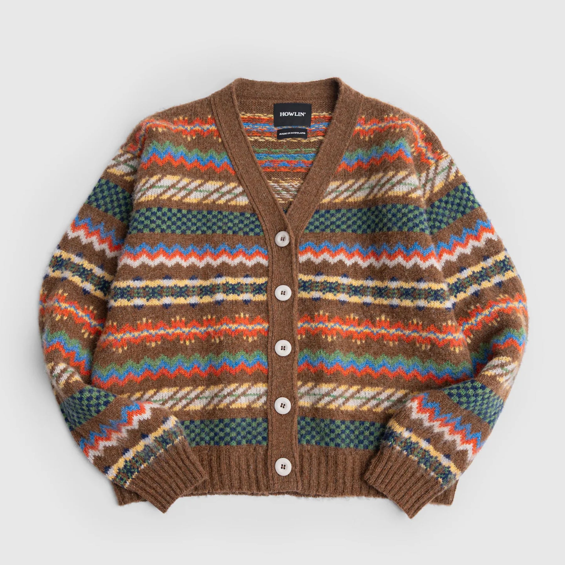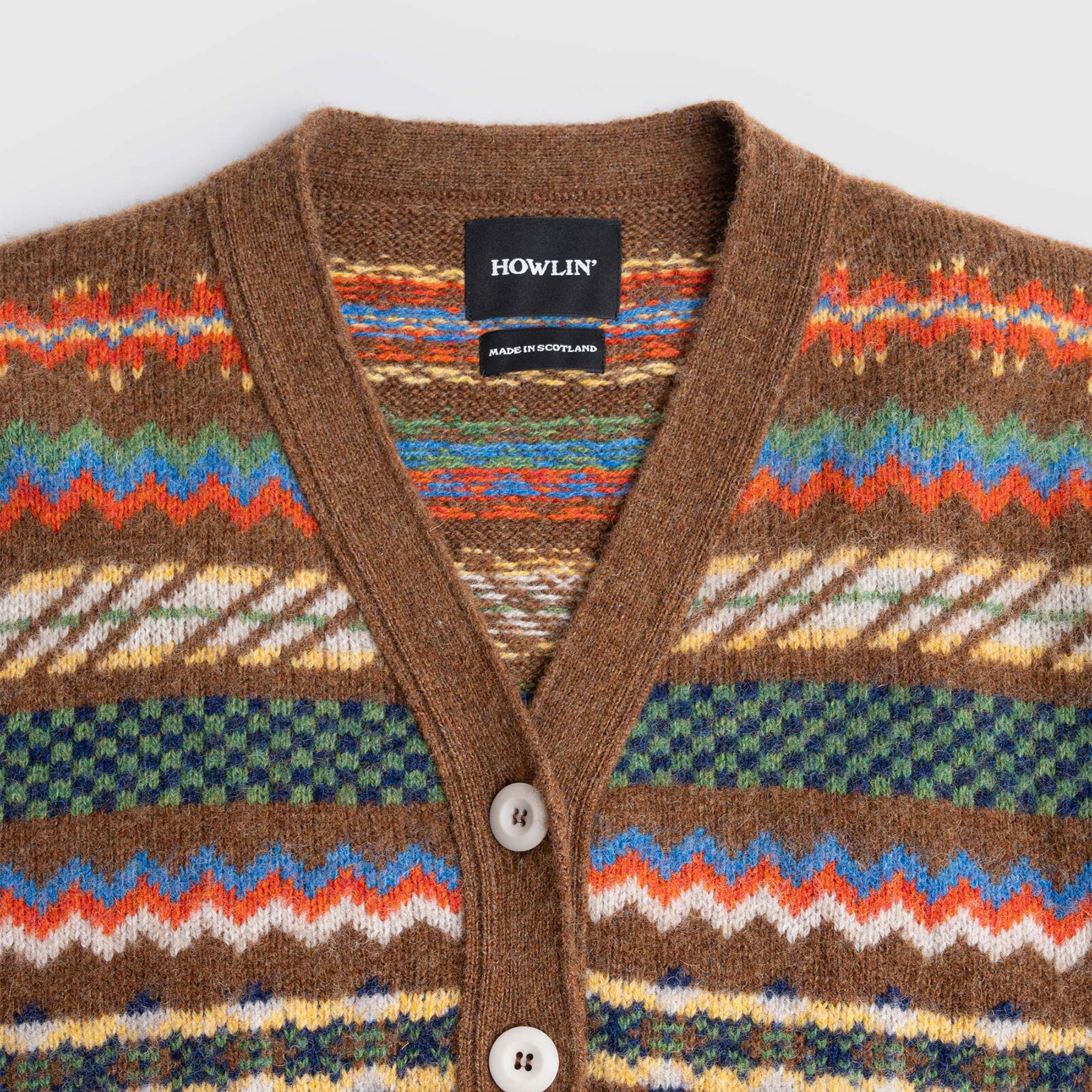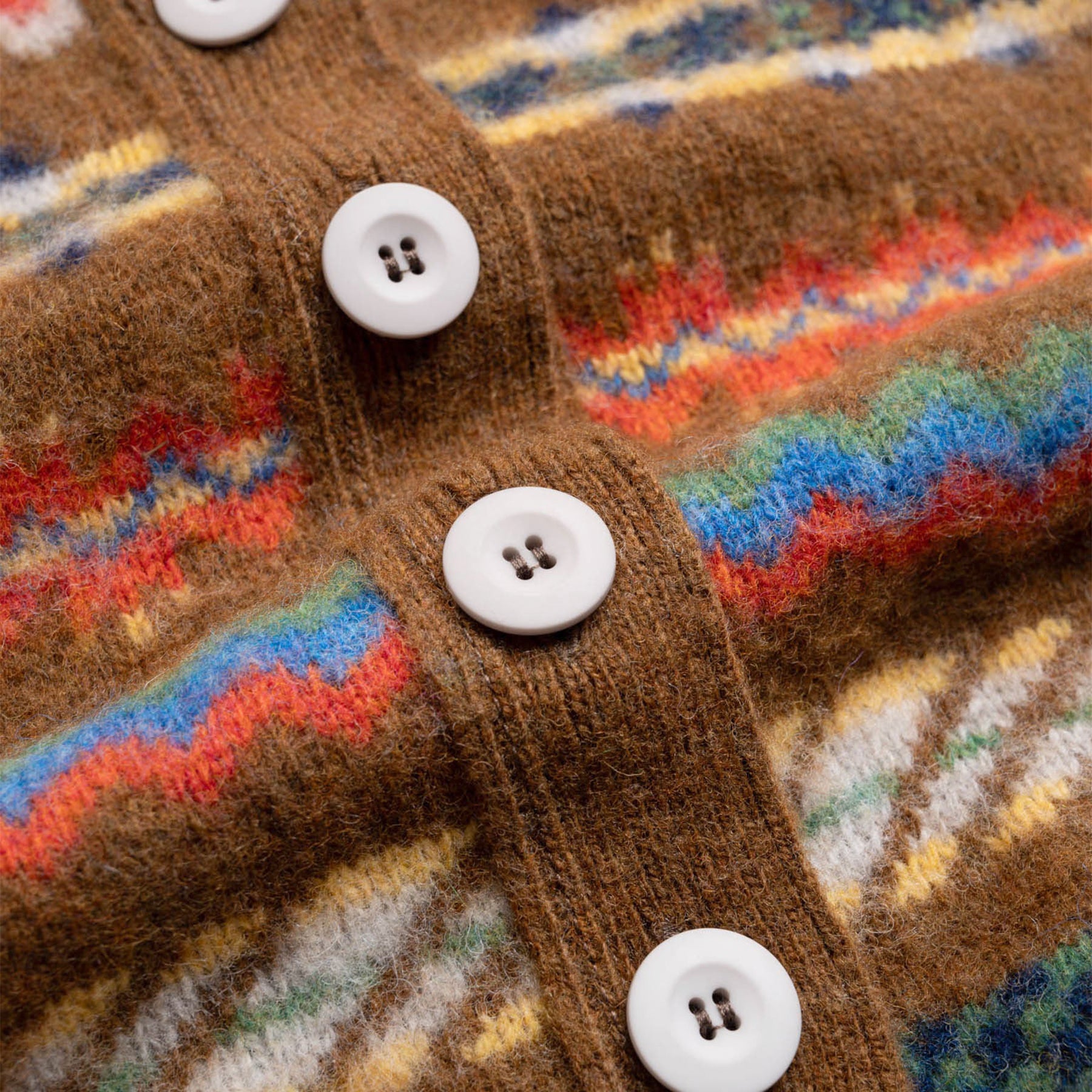 Melodies of Love is a cardigan knitted with a Fair Isle pattern. Crafted in Scotland with a 100% pure wool yarn sourced from the resilient Shetland sheep breed, known for enduring Scottish winters. Due to the limited wool production from each Shetland sheep, the resulting yarn holds a cult status in the market, prized for its exceptional quality and unique properties. Features ribbed hem and cuffs.