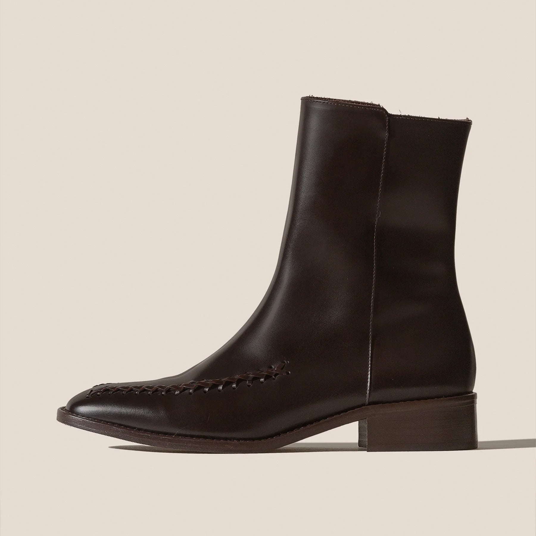 Almond toe mid calf boot featuring braided details. Crafted and polished in a structured cal leather. Leather outsole with a rubber heel. Heel height measures 3.5 cm.