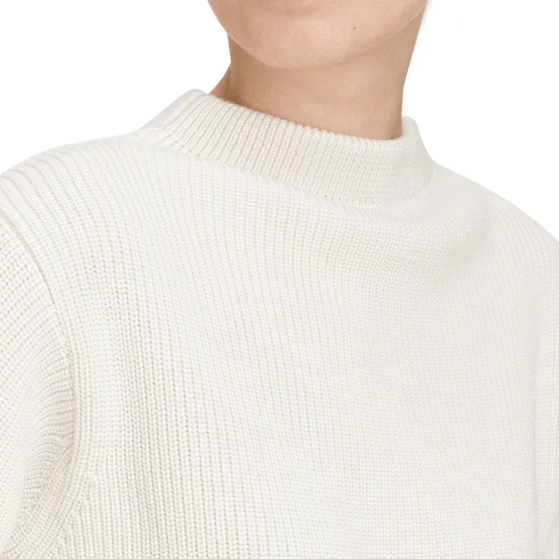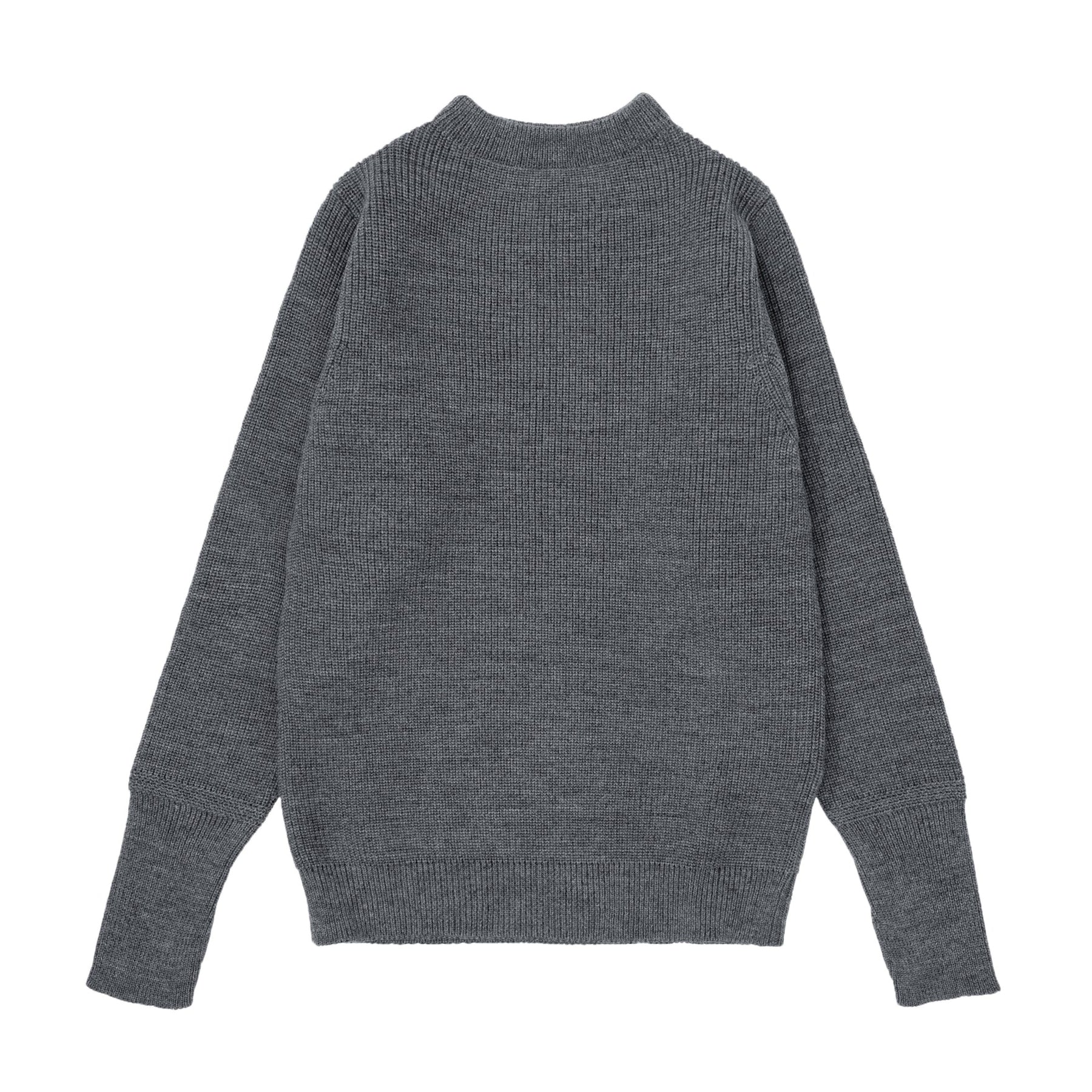 Symmetrical crewneck sweater in a full cardigan stitch. This style has a regular fit and extended sleeve rib with thumb holes. Fully fashioned knitted and linked together. All assemblies are reinforced with bar tacks. Knitted in Pure New Wool for a heavy and durable quality.