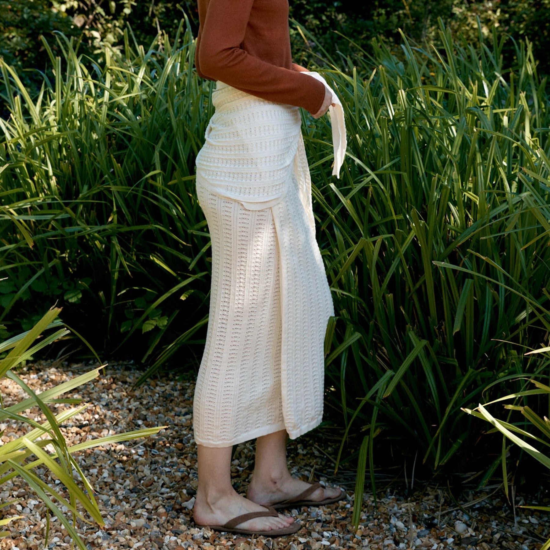 The pointelle wrap skirt is crafted from an organic cotton/merino wool blend. This effortless knit has an irresistibly soft and lightweight hand. Knitted in a Cawley exclusive delicate pointelle stitch, the wrap skirt is the perfect throw-on piece for on the beach or in the city. The skirt is finished with a rib trim and tie, fully adjustable to the wearer's needs. The images show here are styled with a matching knit scarf wrapped around the waist.