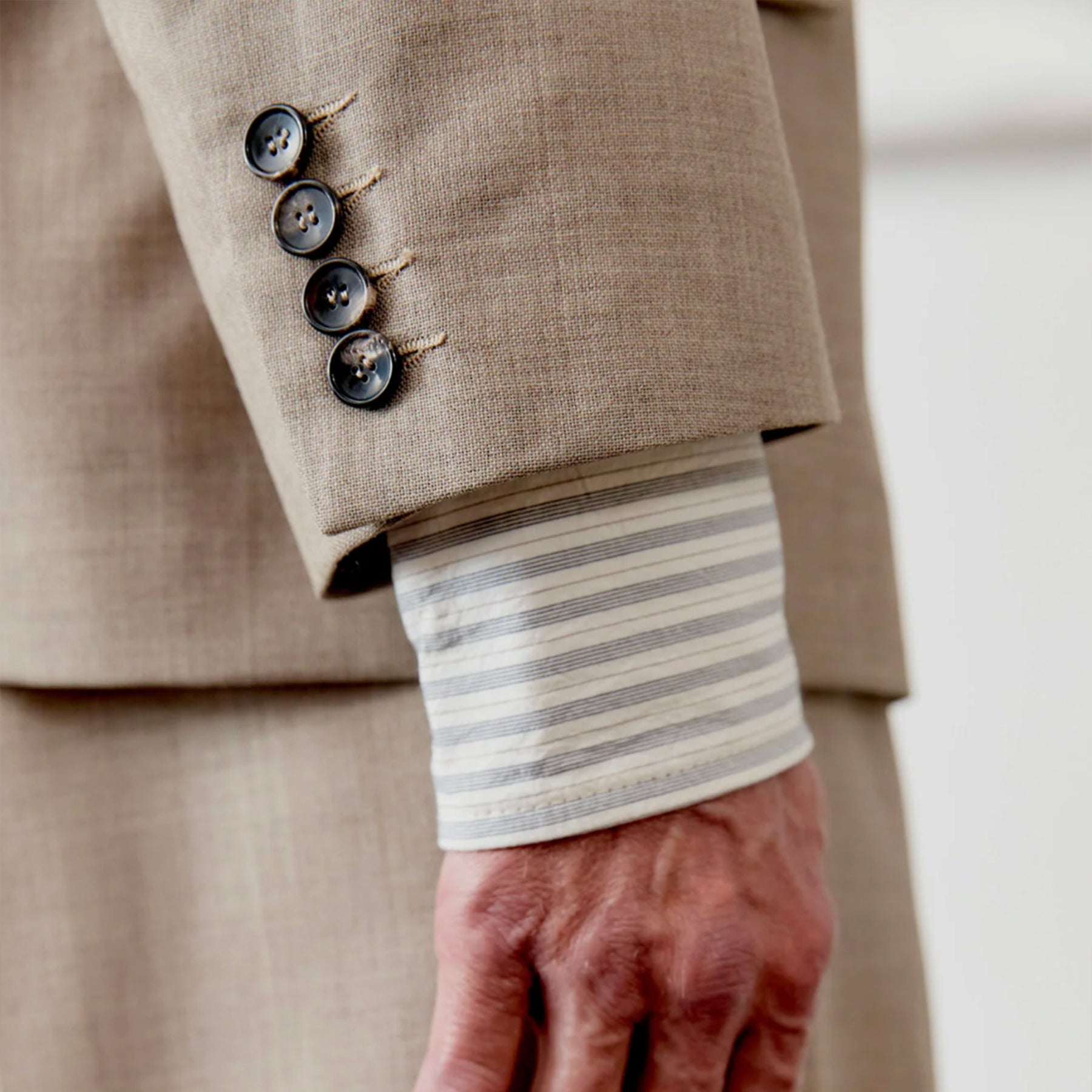 A relaxed fitting, unstructured, two-button blazer cut from a Cawley classic british wool. Features a wide standing notch lapel and flapped welt pockets at the waist. The easy dropped fit through the shoulders and back vent, allows the jacket to have a natural drape. The tailored sleeves and buttoned cuffs balance the silhouette. Fully lined in smooth viscose.