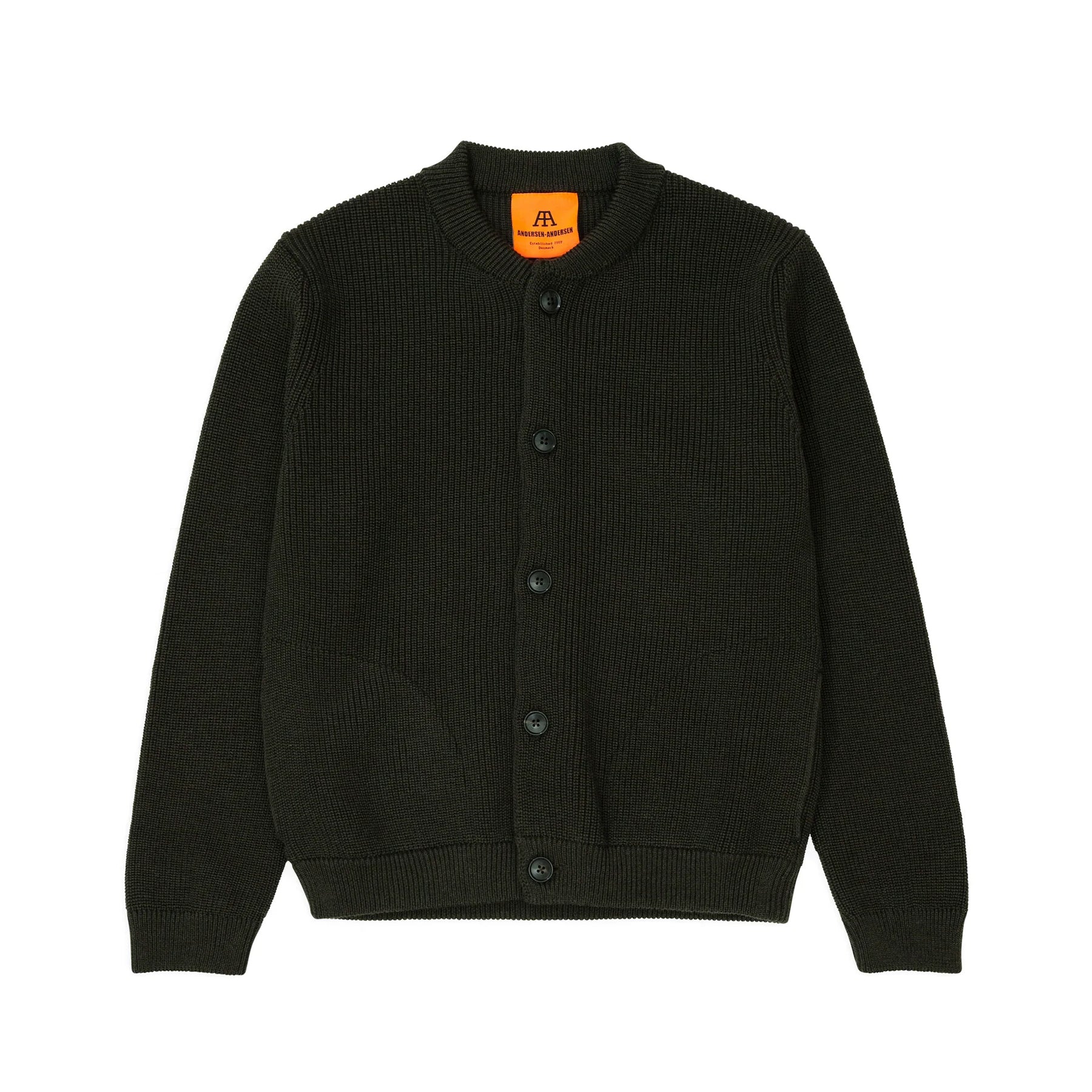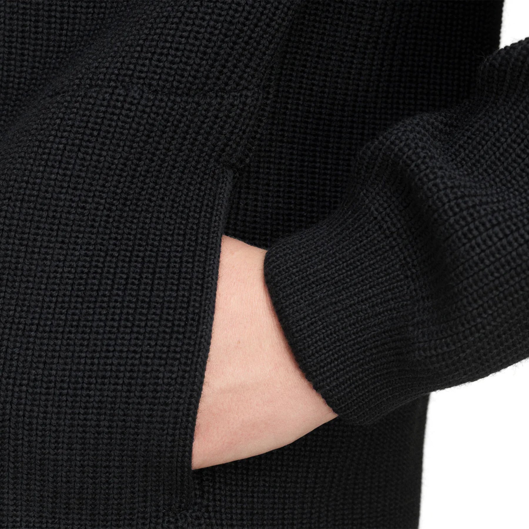 The Skipper Jacket is a firmly knitted cardigan jacket in half cardigan stitch with double folded sleeve ribs. Style has a cropped fit and side pockets with roll edges. Front placket with real buffalo horn buttons and inside placket tape. All assemblies are reinforced with bar tacks. Knitted in Pure New Wool in a compact, medium quality for durability and warmth.