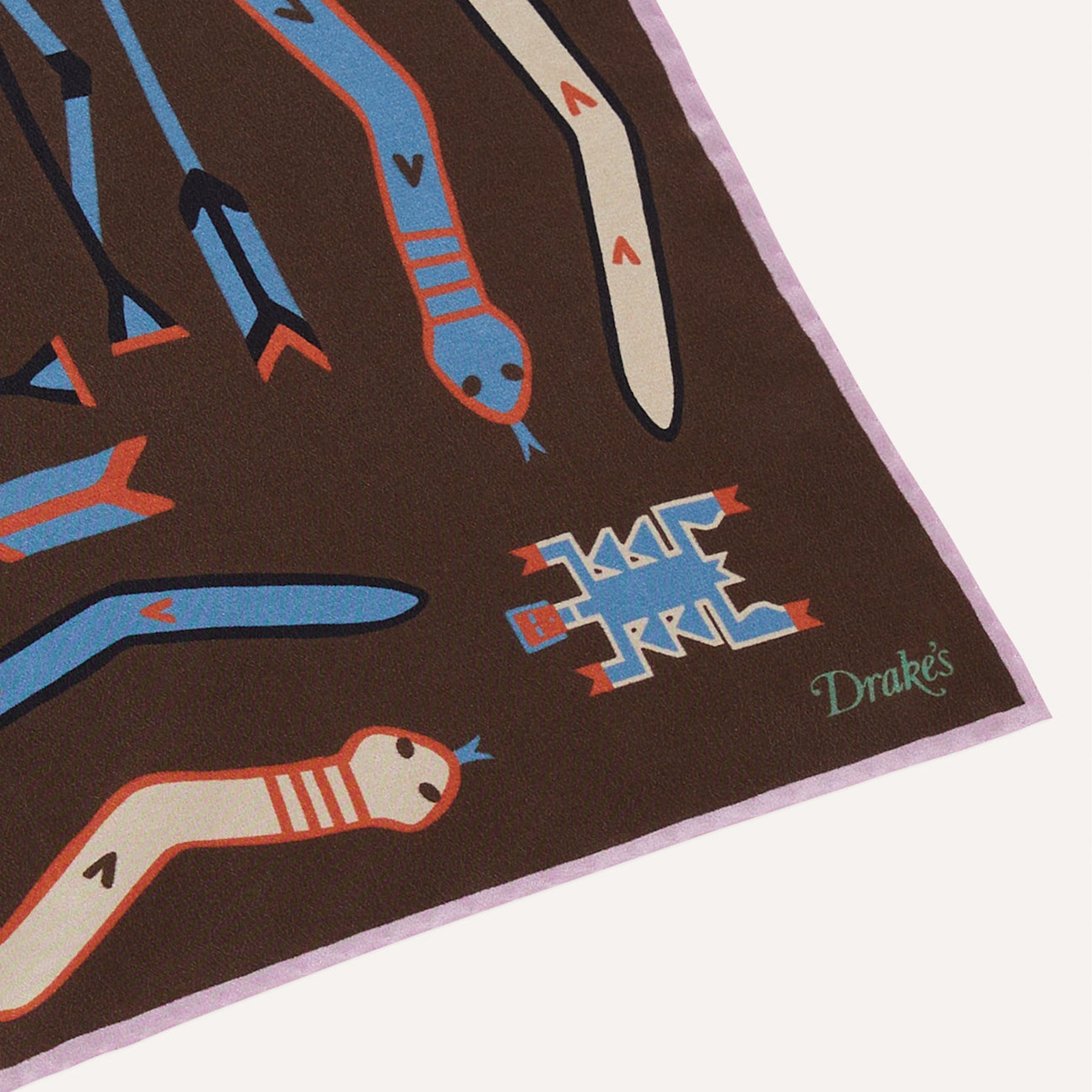 Taken from their extensive design archive, this tribal motif has been vividly applied to a pure silk, creating a dynamic visual contrast however it is folded (or stuffed) in one's pocket. Measures 42cm x 42cm.