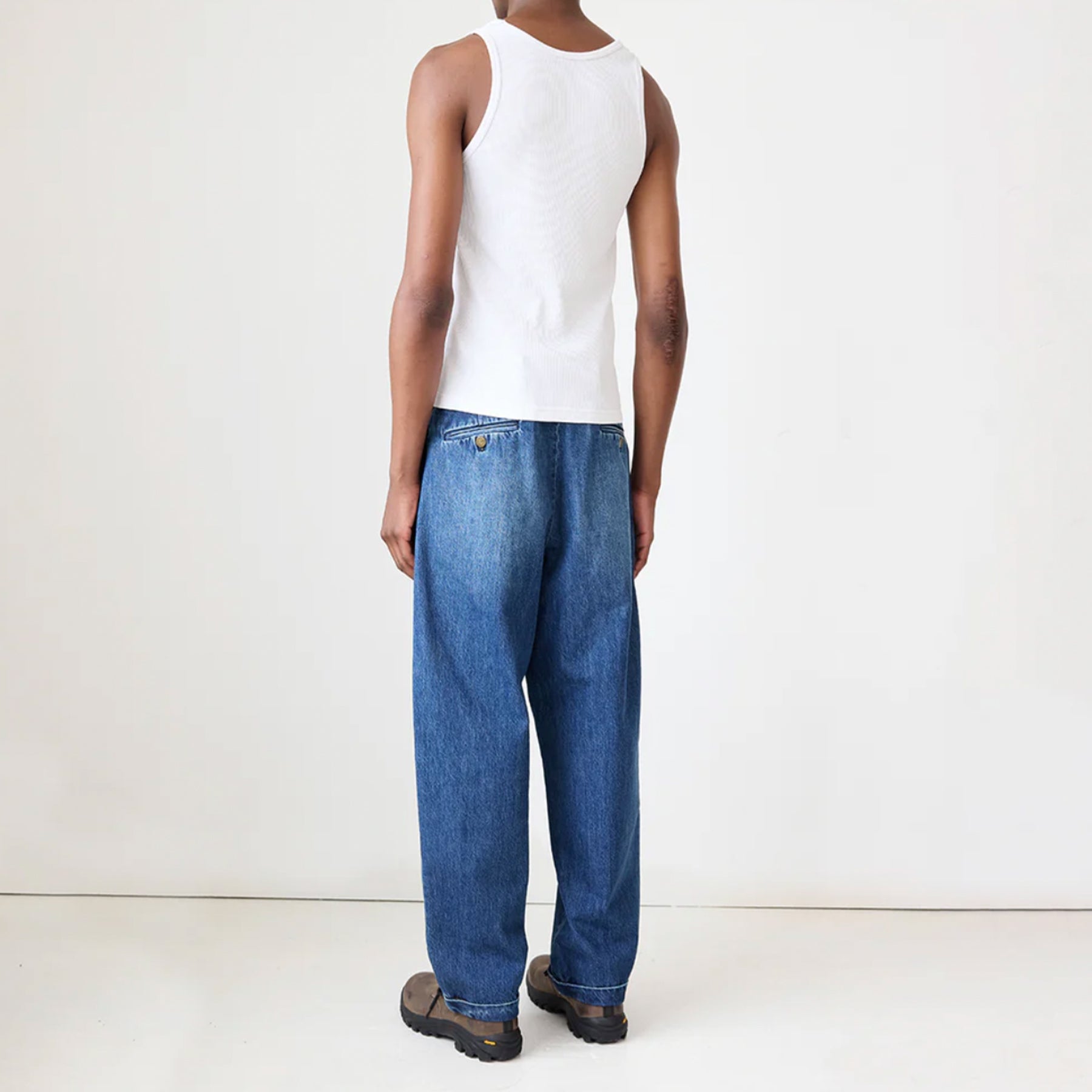 A classic trouser shape with a full hip and a taper toward the hem. Cut in a vintage washed, 14 oz denim, these trousers have double pleats, on seam pockets, faux horn hardware and a cuff at the hem.