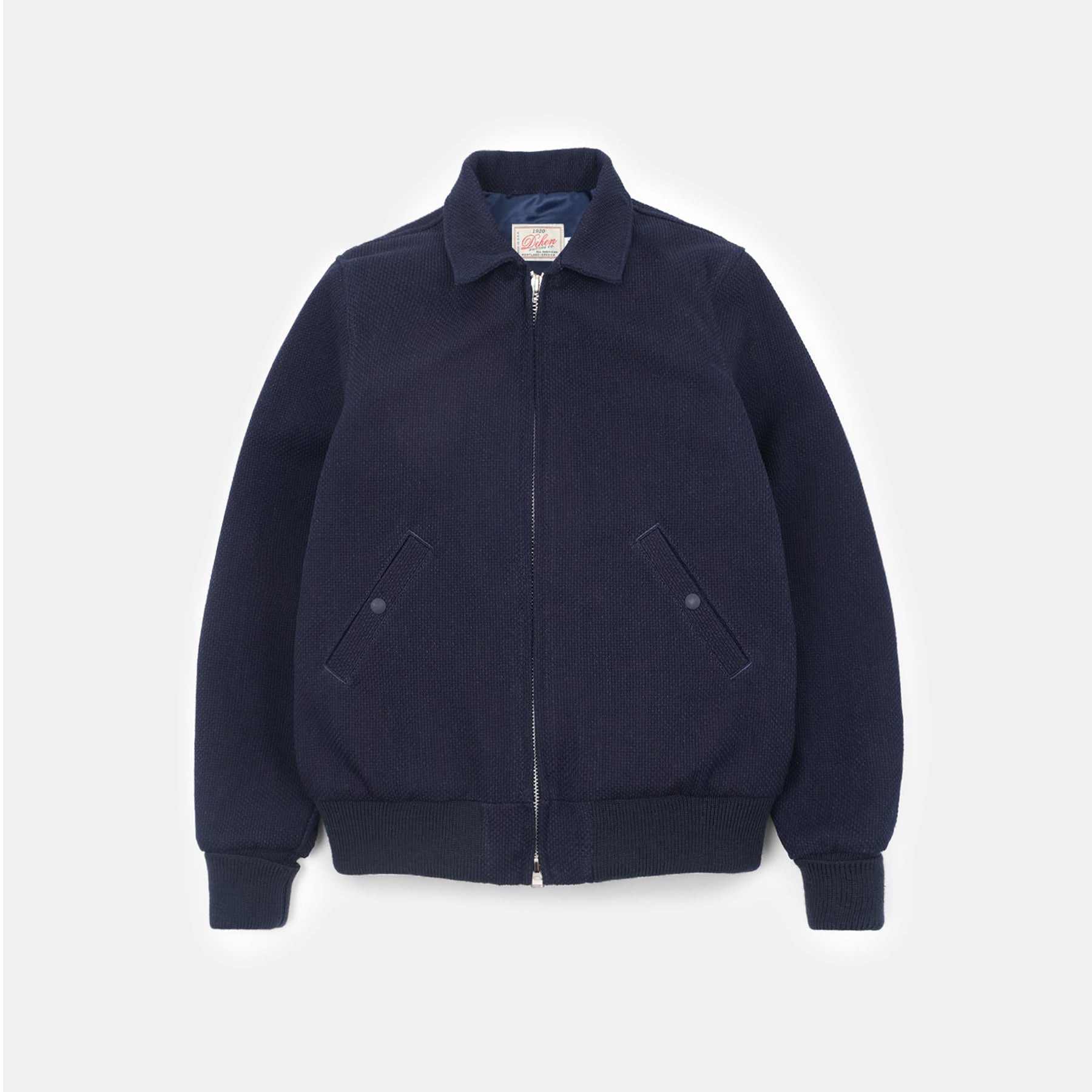 The Weekender Jacket by Dehen 1920 is a handsome, versatile addition to their outerwear lineup. Produced using a 12-ounce, 100% cotton Japanese Sashiko material, this beauty will only age with style. 100% worsted wool 2x2 knit waistband and fold back cuffs. Dark navy straight satin lining in body and sleeves. Featuring interior welt pocket with snap closure and double entry patch pockets.
